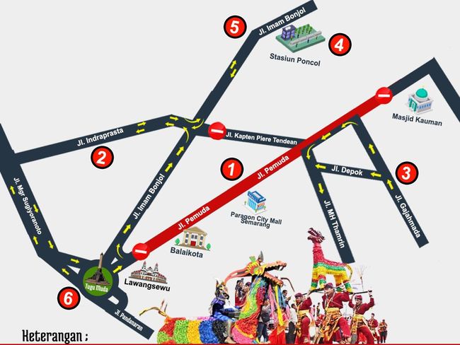 - Arus lalu lintas dari arah Jalan Imam Bonjol (Stasiun Poncol) dialihkan tidak masuk Jalan Pemuda dan diarahkan menuju Jalan Indraprasta (2 arah).