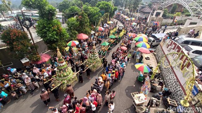 "Ini dimulai dari iring-iringan dari 12 desa yang ada di satu kecamatan. Dengan membawa 3 gunungan yang berisi makanan dan buah-buahan," terangnya.