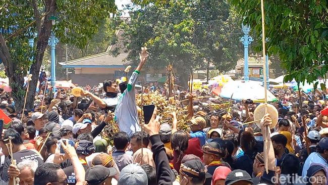 Tak hanya makanan dan hasil bumi, warga juga mengambil kerangka bambu gunungan itu. Bahkan, ada warga yang tangannya terluka karena tersayat rangka bambu.