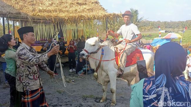 Sebelum dibawa menuju pinggir pantai, sapi dibersihkan dan dihias. Setelah itu, sapi dikirab dari rumah sesepuh desa hingga ke pantai melalui jalan desa yang disebut Jalan Celengan. Tradisi ini memang sudah ada sejak zaman dulu secara turun temurun dari nenek moyang.