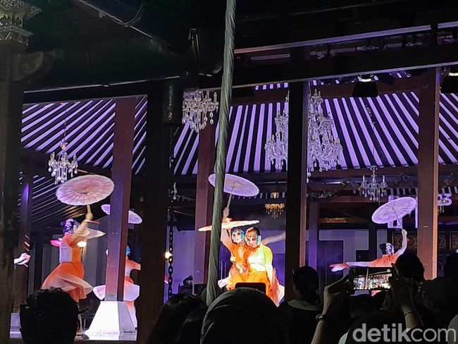 Dalam kegiatan yang dimulai Jumat (17/11) pukul 19.20 WIB, sebagian penonton tampak berfoto dengan topeng Rajamala, ikon Kota Solo, yang berada di area Dalem Joyokusuman.