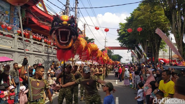 Ribuan orang tumplek blek melihat prosesi kirab Cap Go Meh di Kota Magelang. Dalam kirab ini ada yang istimewa yakni Liong dengan panjang 120 meter.