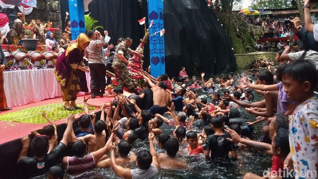 Bupati menyebarkan udik-udik dari atas panggung yang berada di atas air. Masyarakat berbagai usia, berebut di air dan di daratan depan panggung sedangkan ribuan pengunjung lain mandi di beberapa kolam di sekitarnya.