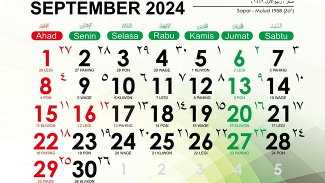 Hari ini, Jumat (6/9/2024) bertemu dengan pasaran Legi. Dalam penanggalan Jawa, hari ini juga bertepatan dengan 2 Mulud 1958, berada di Tahun Je, Windu Sancaya dan Wuku Warigagung.