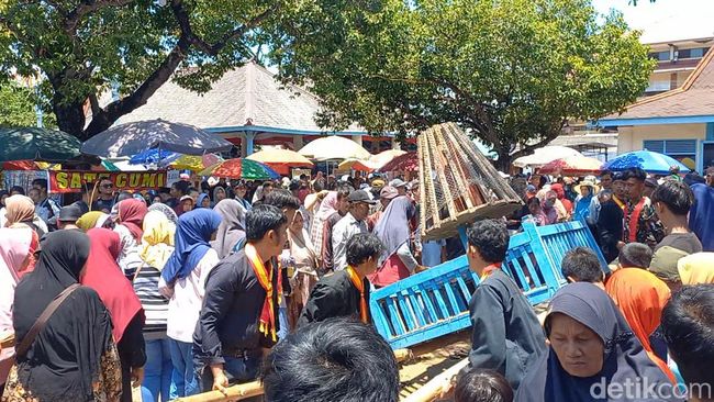 Gunungan yang berisi hasil bumi dan makanan diperebutkan warga. Tak hanya itu, kerangka bambu gunungan dan jerami juga diperebutkan warga.