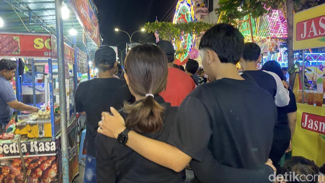 Mereka menikmati wahana permainan dan kulineran khas Dugderan. Bersama orang tersayang, muda-mudi ini pun bergandengan tangan menyusuri jalanan di Pasar Dugderan yang sempit.