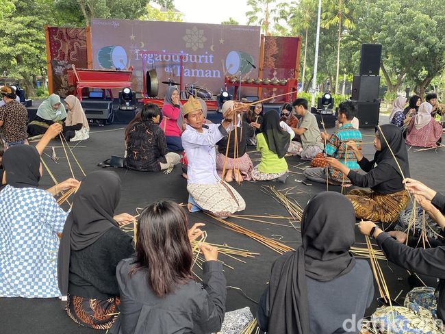 Pantauan detikJateng di lokasi, tampak puluhan muda-mudi tengah asyik menganyam suket atau rumput hingga berbentuk wayang. Mereka dibagi menjadi beberapa kelompok dan mendengarkan arahan dari perajin wayang suket. Kegiatan ini diiringi alunan musik jawa.