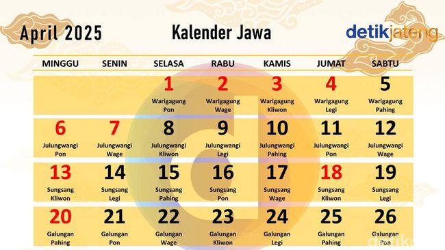 Memasuki bulan April 2025, tidak sedikit masyarakat yang mungkin tengah mencari kalender Jawa untuk dijadikan sebagai pedoman dalam beraktivitas sehari-hari. Oleh karenanya, terdapat informasi seputar kalender Jawa bulan April 2025 lengkap dengan weton yang akan dipaparkan secara rinci di dalam artikel ini sebagai acuan bagi masyarakat.