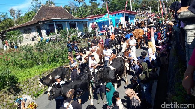 Tradisi unik digelar warga lereng sisi timur Gunung Merapi di Boyolali pada H+7 Lebaran ini. Mereka menggelar tradisi syawalan dengan mengarak sapi keliling kampung.