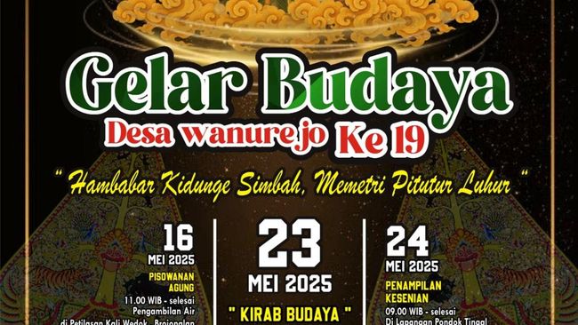 Gelar Budaya Desa Wanurejo ke-19 dengan mengambil tema 'Hambabar Kidunge Simbah, Memetri Pitutur Luhur'. Kirab budaya akan dilangsungkan, Jumat (23/5) mulai pukul 19.00 WIB.