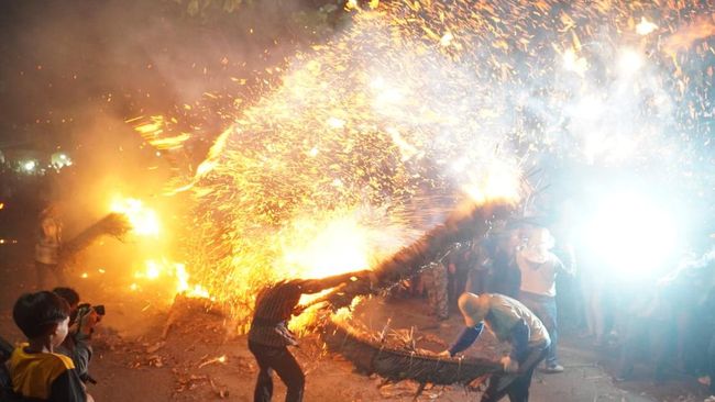 Tradisi perang obor di Desa Tegalsambi, Kecamatan Tahunan, Kabupaten Jepara, malam tadi dipadati warga. Tradisi ini rutin digelar setiap tahun untuk merayakan sedekah bumi. Berikut potretnya.