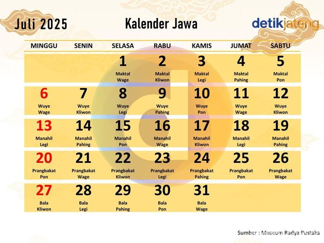 Hari ini, Senin (7/7/2025) bertemu dengan pasaran Kliwon. Dalam penanggalan Jawa, hari ini juga bertepatan dengan 11 Sura 1959, berada di Tahun Dal, Windu Sancaya dan Wuku Wuye.