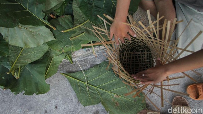 Kreneng bambu dilapisi dengan daun Jati sebagai tempat daging kurban yang akan dibagikan warga saat hari raya Idul Adha 1443 H, bertujuan mengurangi penggunaan plastik sekali pakai. Foto: Pius Erlangga/detikJateng