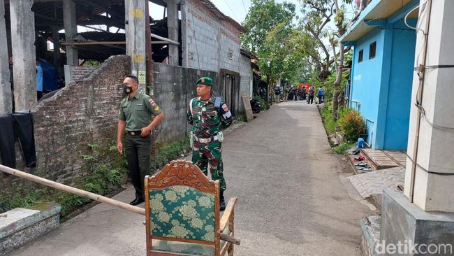 Personel gabungan TNI-Polri berjaga di sekitar rumah orang tua Kopda Muslimin. Lokasi tersebut berada di Kelurahan Trompo, Kecamatan Kota Kendal. (Foto: Dimas Saktyo R./detikJateng)