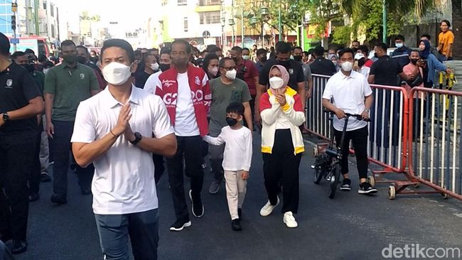 Solo - Presiden Joko Widodo berjalan-jalan di CFD Solo pagi ini. Gubernur Jateng Ganjar Pranowo dan Menteri BUMN Erick Thohir juga hadir di momen itu.