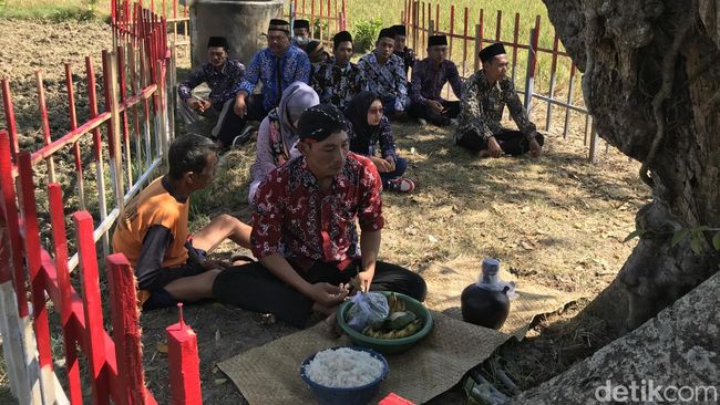 Sejumlah tokoh di Desa Pelemsari mengawali doa bersama di bawah sebuah pohon di lokasi pepunden. Dipimpin oleh kades setempat. Foto: Mukhammad Fadlil/detikJateng