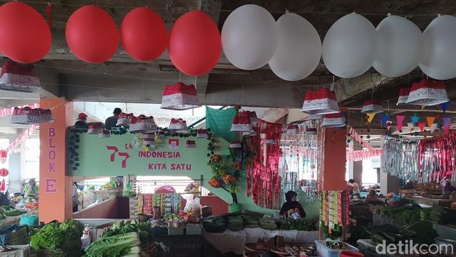 Semarak Kemerdekaan RI jelas terlihat di Pasar Rejowinangun, Kota Magelang. Para pedagang menghias kios maupun los dengan pernak pernik bertema HUT RI. Hal ini dilakukan para pedagang untuk memeriahkan HUT Kemerdekaan RI ke-77 serta guna menarik pengunjung pasar. Foto: Eko Susanto/detikJateng