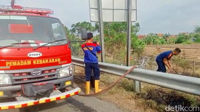 Koordinator Damkar Satpol PP Brebes, Sugiarto, mengatakan informasi kebakaran diterima pukul 15.08 WIB. Disebutkan, kebakaran ini terjadi tidak jauh dari tol gate Brebes Timur. Foto: Imam Suripto/detikJateng
