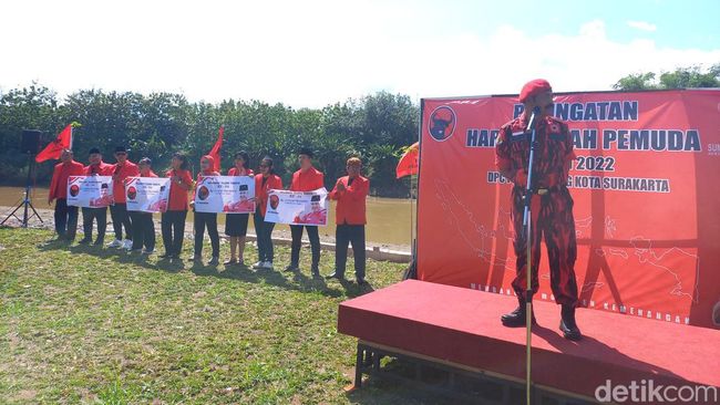 Upacara dipimpin oleh Ketua DPC PDIP Solo, FX Hadi Rudyatmo di Taman Sunan Jogo Kali, Kelurahan Pucangsawit, Kecamatan Jebres, Kota Solo. Pembentangan poster dilakukan saat FX Rudy memberikan arahan di tengah upacara. Foto: Agil Trisetiawan Putra/detikJateng