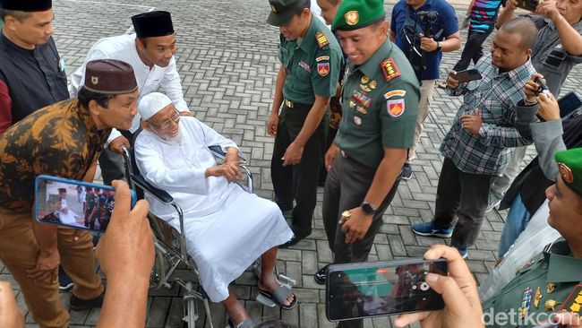 Abu Bakar Ba'asyir nampak datang dengan menggunakan kursi roda dan mengenakan baju gamis warna putih. Foto: Agil Trisetiawan Putra/detikJateng
