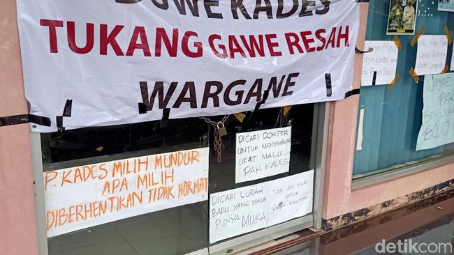 Hanya ada spanduk yang ditempel di depan kantor pemerintah Desa tersebut. Di antaranya bertuliskan ‘turunkan Kades Lengkong’ dan ‘Pak Bupati kami malu punya kades tukang zina segera lengserkan’. Foto: Uje Hartono/detikJateng