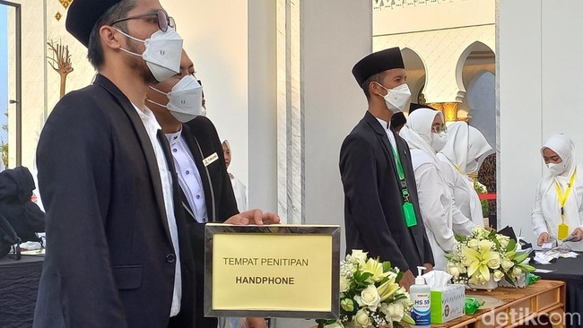 Solo - Ketatnya penjagaan jelang peresmian Masjid Sheikh Zayed Solo, Senin (14/11/2022) pagi. Tamu undangan diperiksa dengan screening ketat. Tas-HP harus dititipkan.