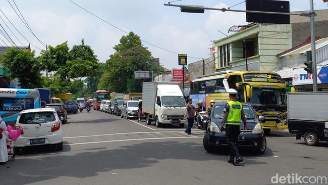 Kepadatan lalu lintas dan personel polisi mengatur lalu lintas di kawasan Pasar Kliwon Solo. Foto: Agil Trisetiawan Putra/detikJateng