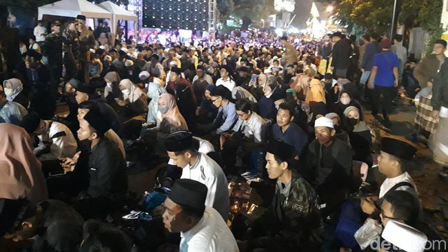 Pantauan detikJateng di lokasi, para jamaah baik laki-laki dan perempuan mulai membanjiri lokasi acara. Mereka mulai mendekat dan duduk-duduk di sekitar panggung. Foto: Jarmaji/detikJateng