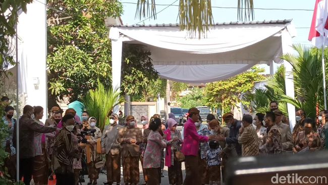 Presiden Jokowi dan Ibu Negara Iriana Widodo menyalami tamu di kediamannya di Solo sebelum memulai proses pemasangan bleketepe dan tuwuhan, Jumat (9/12/2022) pagi. Foto: Tara Wahyu NV/detikJateng
