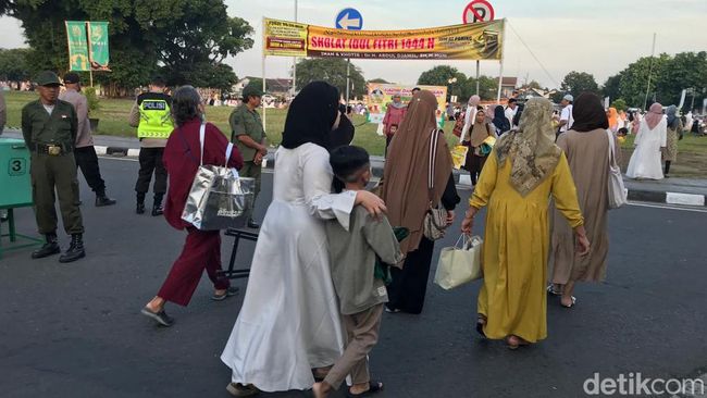 Jakarta - Warga Muhammadiyah merayakan 1 Syawal 1444 H atau Hari Raya Idul Fitri hari ini. Jemaah melaksanakan salat Id dengan khidmat di Alun-alun Kidul (Selatan) Jogja.