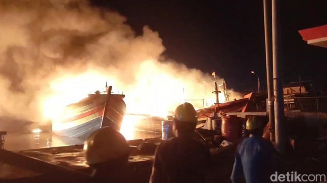 Tegal - Kebakaran kapal terjadi di Pelabuhan Jongor, Tegalsari, Kota Tegal, Senin (14/8/2023) malam. Dilaporkan 51 kapal terbakar. Begini potretnya.