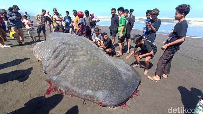 Cilacap - Hiu tutul sepanjang 7 meter dan seberat 2,5 ton mati setelah terdampar di Pantai Welahan Wetan, Cilacap, Kamis (26/6/2025). Dagingnya lalu jadi rebutan warga.