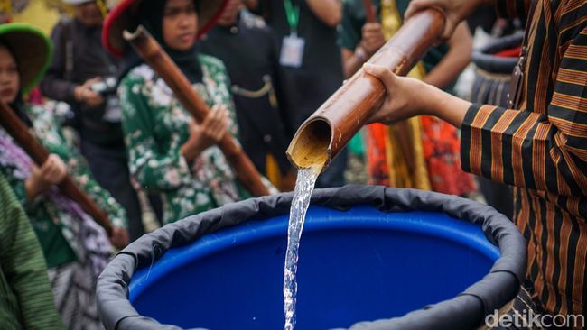 Purbalingga - Warga di Desa Serang, Karangreja, Kabupaten Purbalingga, punya tradisi unik. Mereka akan mengambil air dari Thuk (mata air) suci Sikopyah pakai bambu lodong.