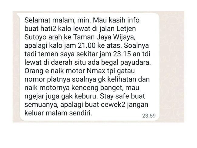 "Selamat malam, min. Mau kasih info buat hati-hati kalau lewat Jalan Letjen Sutoyo arah ke Taman Jaya Wijaya, apalagi kalau jam 21.00 ke atas. Soalnya tadi teman saya sekitar jam 23.15-an lewat daerah situ ada begal payudara."
