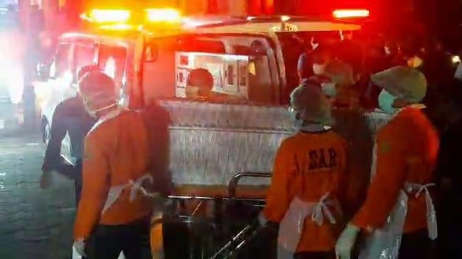 Pemindahan dilakukan secara bergantian dengan dua ambulans berdampingan. Petugas memindahkan peti jenazah ke ambulans yang akan membawa korban ke rumah duka.