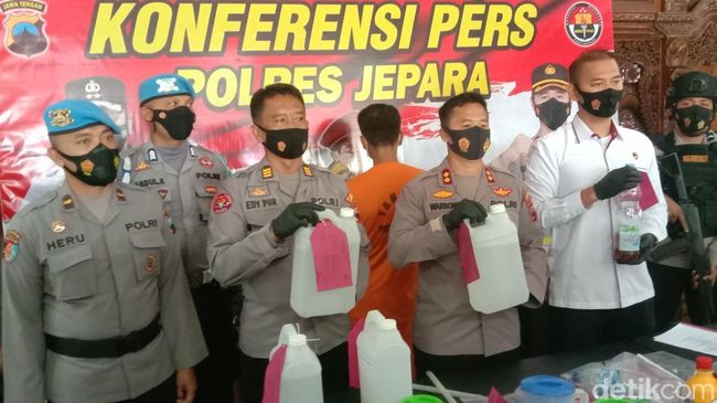 "Pelaksanaan peracikannya bersangkutan diajari oleh seseorang di mana racikannya terdiri dari 2 liter etanol, ditambah satu galon air putih, diaduk setelah diaduk dikasih perasa, ada kopi, nanas, kemudian dibungkus 1,5 liter. Satu botolnya harganya Rp 30 ribu," jelas Kasat Reskrim Polres Jepara, AKP M. Fahrur Rozi saat konferensi pers di Mapolres Jepara, Senin (7/2/2022).