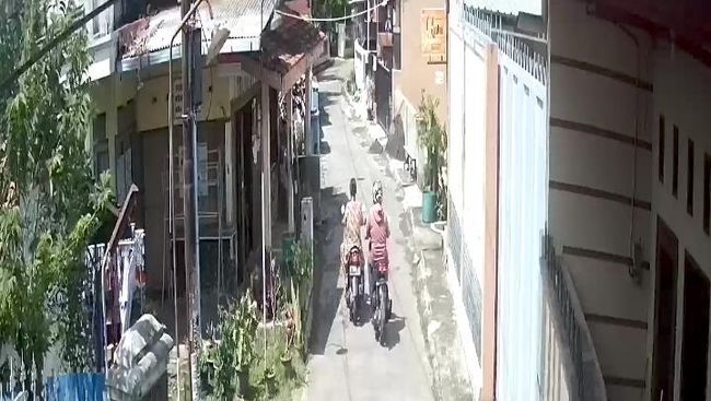 Terlihat emak-emak mengendarai sepeda motor melintas di sebuah gang. Terlihat di video itu ada seorang pria mengendarai sepeda motor memakai helm, jaket berwarna merah melintas dari belakang emak-emak.