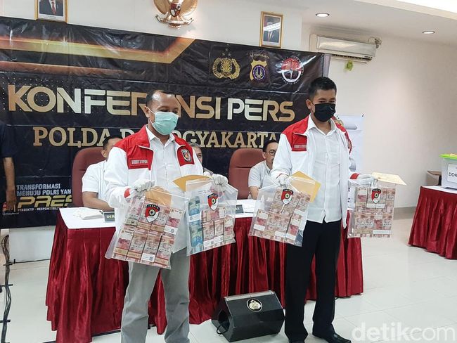 Duit yang diamankan polisi itu ditampilkan dalam rilis kasus di Mapolda DIY hari ini. Uang Rp 470 juta itu dalam pecahan Rp 100 ribu dan Rp 50 ribu.