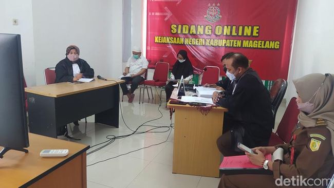Dalam persidangan dua terdakwa, penasihat hukum dan jaksa penuntut umum yang terdiri Heri Zuniarto dan Novan Ariyanto berada di ruang sidang online Kejaksaan Negeri Kabupaten Magelang, Rabu (3/8/2022).