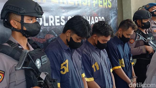Pantauan detikJateng, ketiga pelaku tampak menggunakan baju tahanan Polres Sukoharjo nomor 11, 57, dan 99. Ketiganya terlihat tertunduk lesu dengan tangan diborgol.