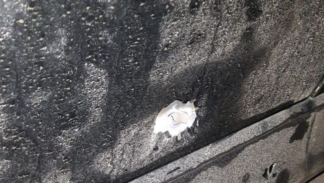 Berikut penampakan bekas peluru yang ditembakkan oleh penembak misterius. Bekas tembakan terlihat jelas pada pintu bagian bawah. Peluru yang ditembakkan oleh pelaku meninggalkan lubang berukuran sekitar 2 cm. Bahkan, Jari telunjuk orang dewasa pun, bisa masuk ke lubang tersebut.
