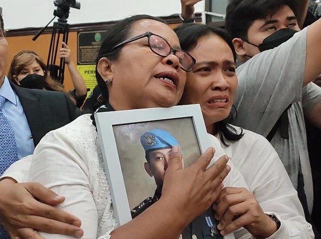 Saat hakim memvonis Putri Candrawathi dengan 20 tahun penjara, Rosti pun menangis. Anak Rosti, Yuni Hutabarat, nampak menenangkan ibunya.
