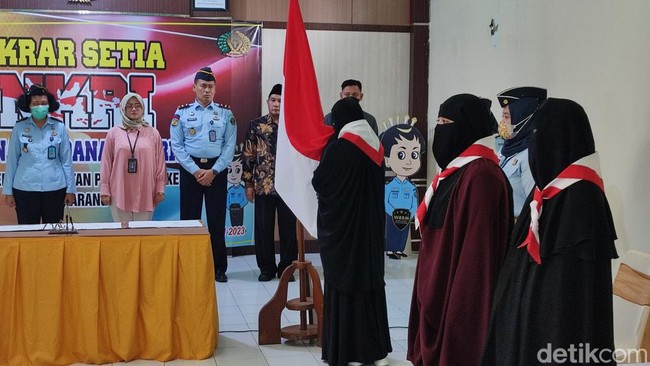 Pernyataan sumpah setia itu dilaksanakan di Lapas Perempuan Semarang, Kamis (16/2/2023). Ketiga napiter mengenakan baju gamis dengan cadar yang dilengkapi hasduk merah putih.