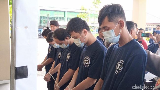 Kini keenam tersangka hanya tertunduk saat dihadirkan dalam pers rilis yang digelar Jumat (24/2/2023). Mereka tampak mengenakan seragam tahanan warna biru dan tangan terborgol.