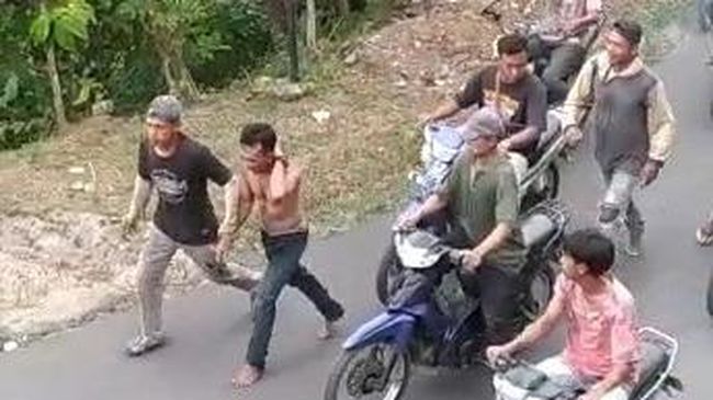 Video kehebohan saat pria itu diarak dengan hanya mengenakan celana panjang juga beredar di media sosial.