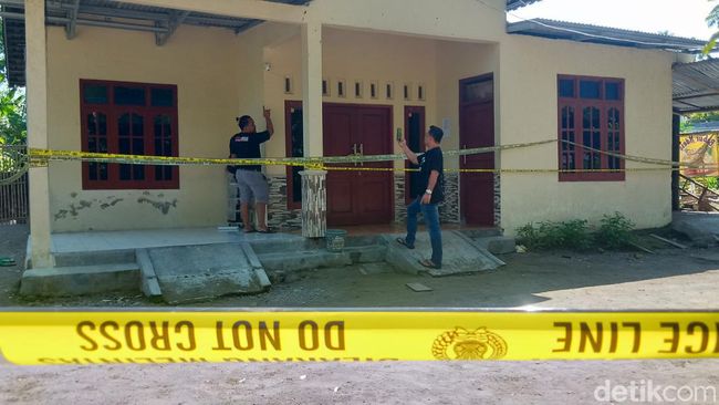 Garis polisi dipasang di halaman rumah. Sejumlah petugas kepolisian berada di lokasi mengumpulkan keterangan.