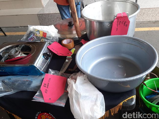 Polisi juga menyita alat masak seperti kompor beserta gas elpiji 3 kilogram, baskom, panci berukuran besar, serbet. Kemudian ember, tali, kantong kresek, palu berukuran kecil, ponsel, dan barang-barang lain.