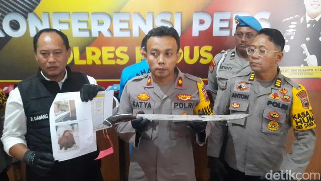 Pelaku dihadirkan saat konferensi pers di Mapolres Kudus. Dia tampak mengenakan pakaian tahanan dengan tangan diborgol.