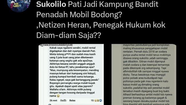 Pascapengeroyokan rombongan rental asal Jakarta yang dikira maling, kini wilayah Sukolilo, Pati, ramai dicap sebagai kampung bandit penadah mobil bodong. Tudingan itu ramai disampaikan di media sosial. Begini penjelasan Camat Sukolilo, Andrik Sulaksono.