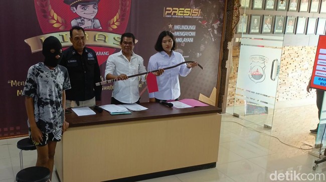 Dia diamankan hari Minggu (4/8) di Jalan Barito Raya ketika polisi mendapat laporan ada yang hendak tawuran. Polisi datang dan dia berada di lokasi sambil membawa senjata sepanjang 1,5 meter dengan ujung melengkung seperti celurit.
